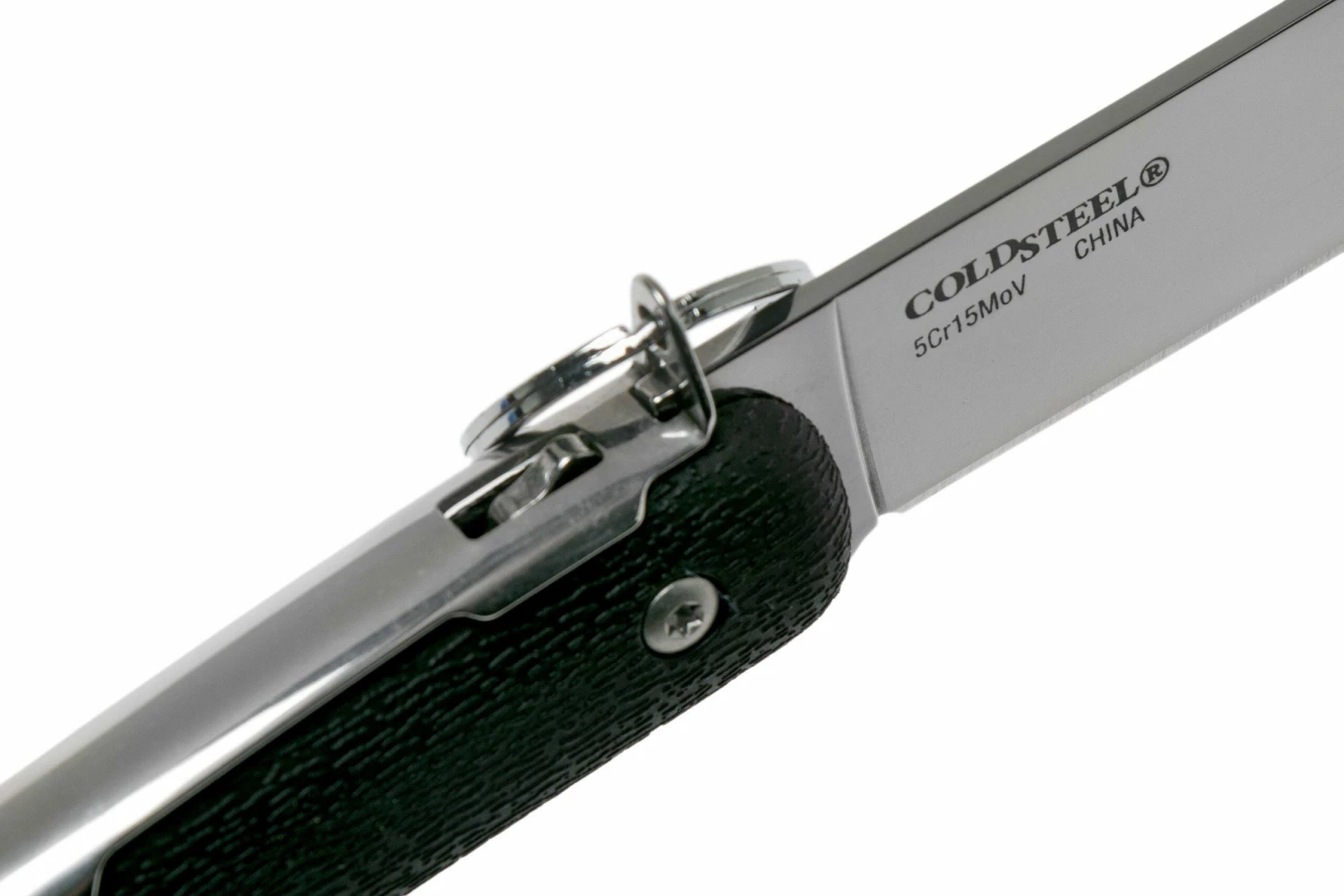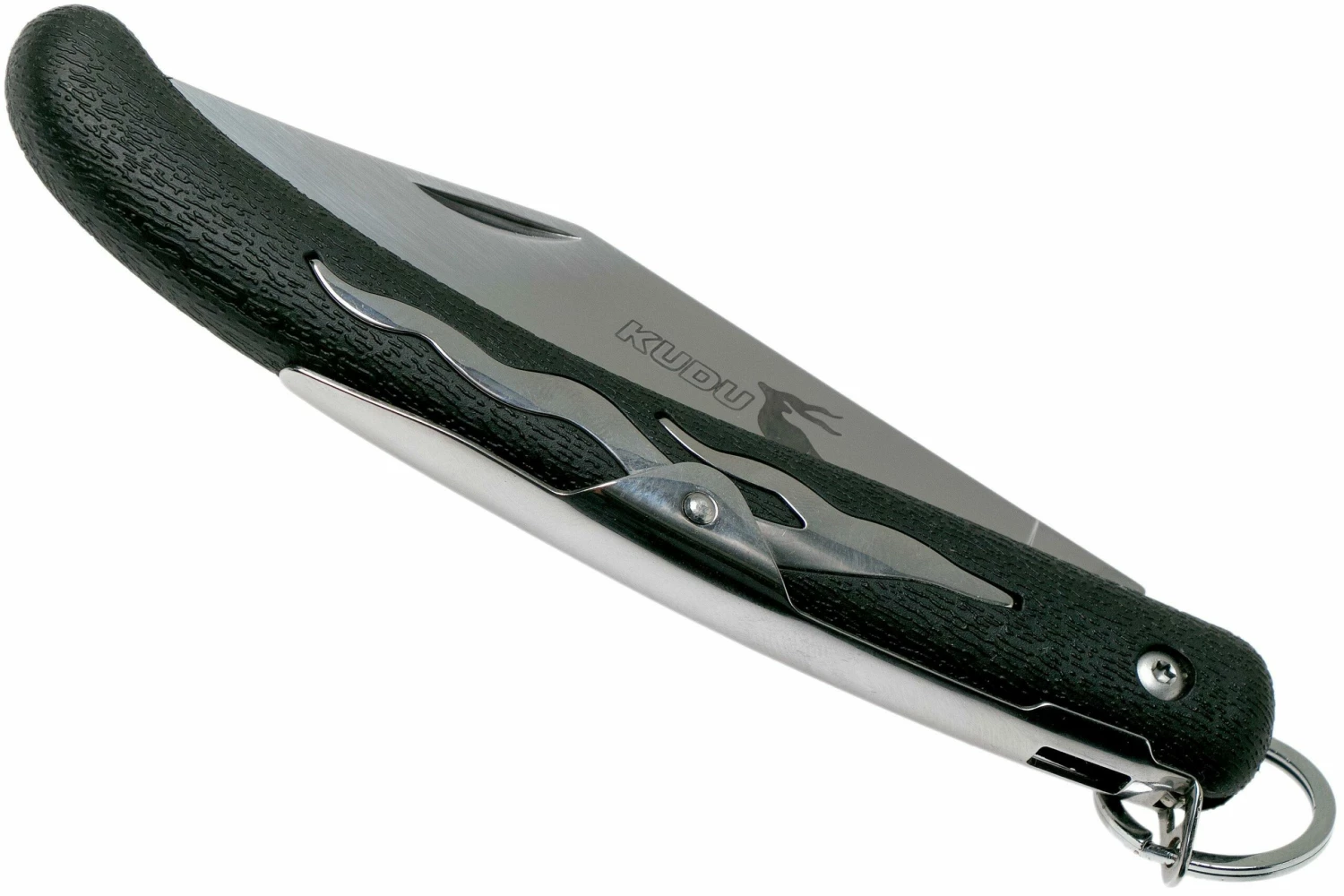 La Cold Steel Kudu 20KK es una extraordinaria navaja, con fuertes raíces sudafricanas. Destaca el gran llavero sobre el pivote. Forma parte del llamado «cierre de anillo». Tirando del anillo se desbloquea la cerradura. Puede que te cueste acostumbrarte al principio, pero cuando lo hagas, será pan comido. Hemos observado que la siguiente técnica es la que mejor funciona: Coloca el dedo índice en el anillo, el pulgar en la hoja y utiliza los dedos corazón y anular para apoyarte en el lomo del mango. Tira del dedo índice y el cuchillo se desbloqueará.
