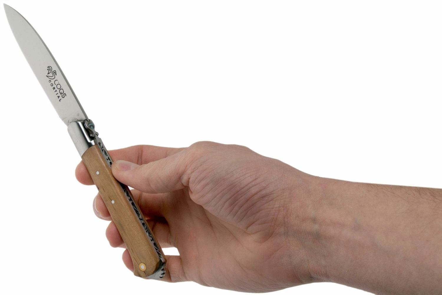 La colección «5 Coqs» de Fontenille Pataud debe su nombre a un pequeño pueblo, Yssingeaux, en Francia. Se pronuncia como «i-sin-jo» y significa, en el dialecto local, «cinco gallos jóvenes». Los gallos no aparecen únicamente en el nombre de la serie de cuchillos. La hoja también presenta un gallo estilizado. El número «5» está bellamente realizado en forma de gallo. Y el dorso del cuchillo recuerda bastante a la cabeza de un gallo con cresta. Presta atención a los ojos del gallo, que presentan dos colores. Fíjate también en el esquilón de perlas que se ha añadido a la «mosca» alternativa, que tiene una forma casi de Ankh eqipcio.