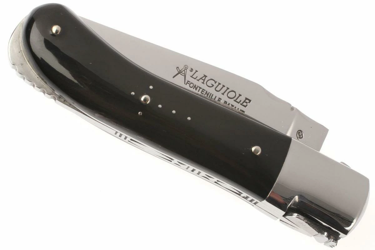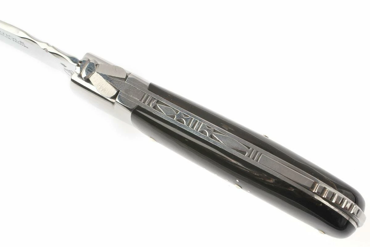 Clásica navaja francesa Laguiole sólidamente hecha a mano. Longitud cerrada: 10,5 cm Mejorada con hoja de acero 14C28N. Mango con cachas de cuerno de búfalo negro.