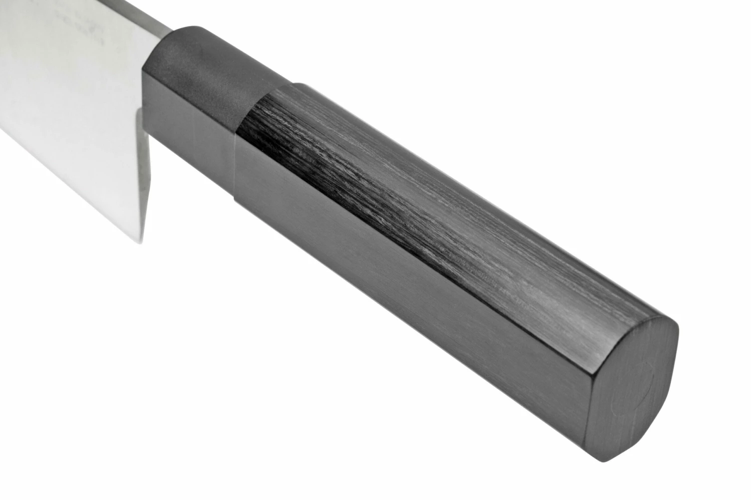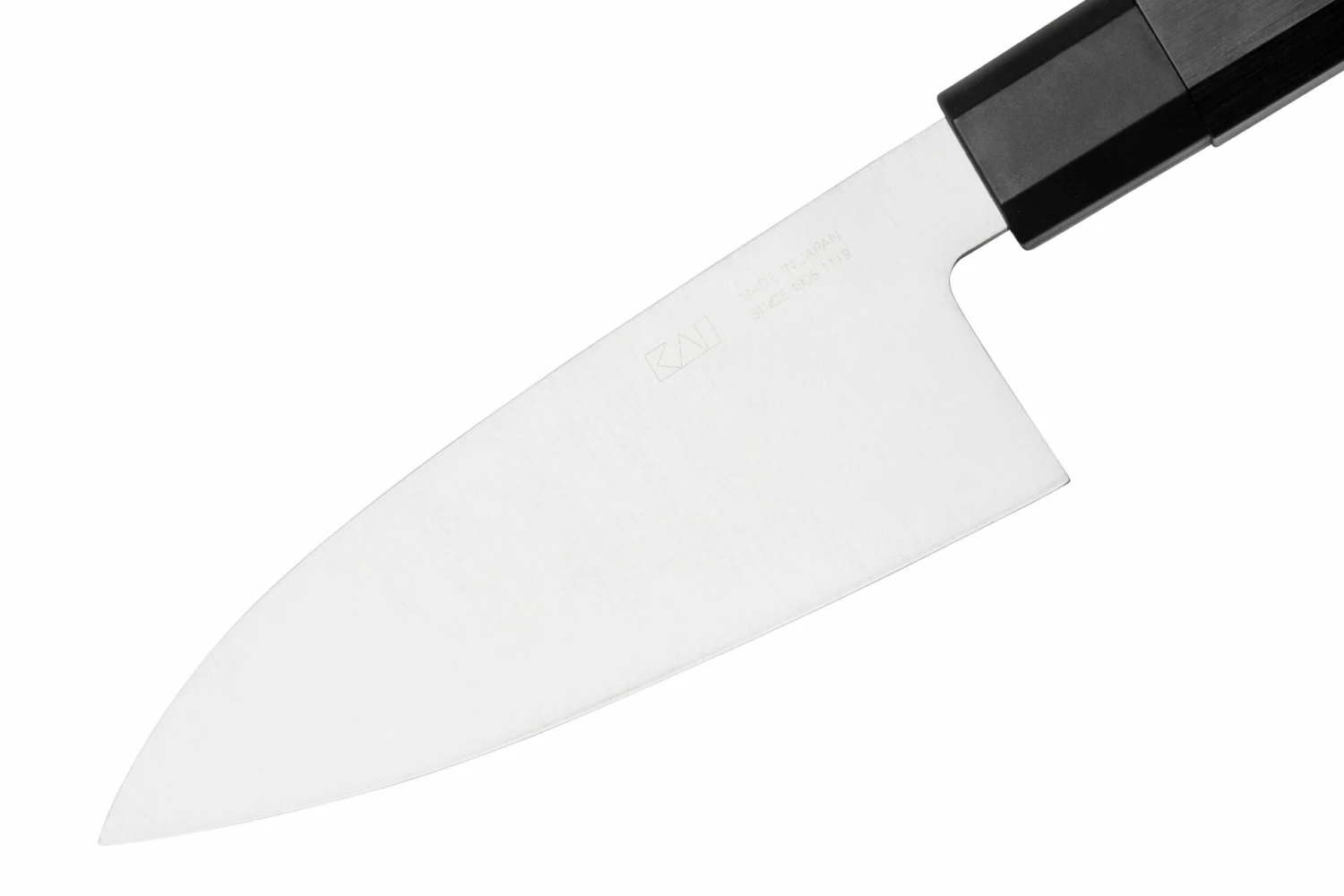 El Kai Seki Magoroku Kinju Deba 15 cm es muy utilizado en la tradición japonesa como hacha, pero también está diseñado para realizar cortes muy precisos. La parte delantera de este cuchillo, pesado pero estable, se utiliza para filetear y la parte trasera para cortar huesos y tendones. Con su imponente hoja, este cuchillo destaca sin duda en la cocina, pero sigue siendo muy agradable para trabajar.