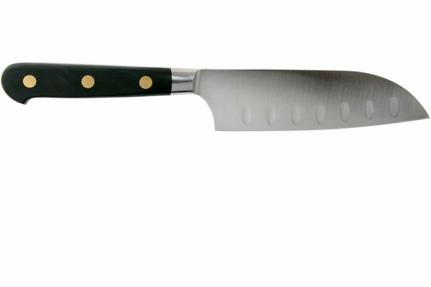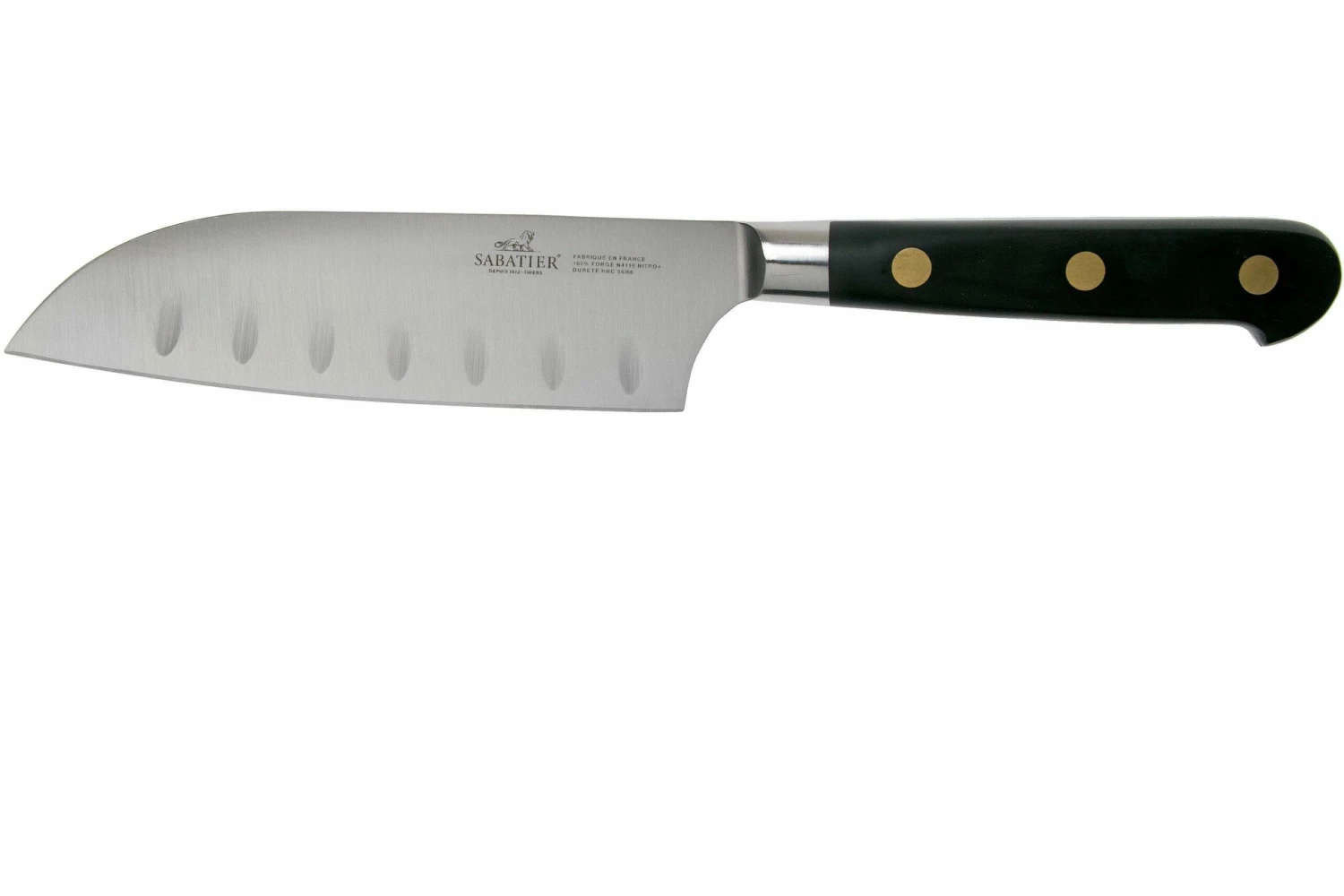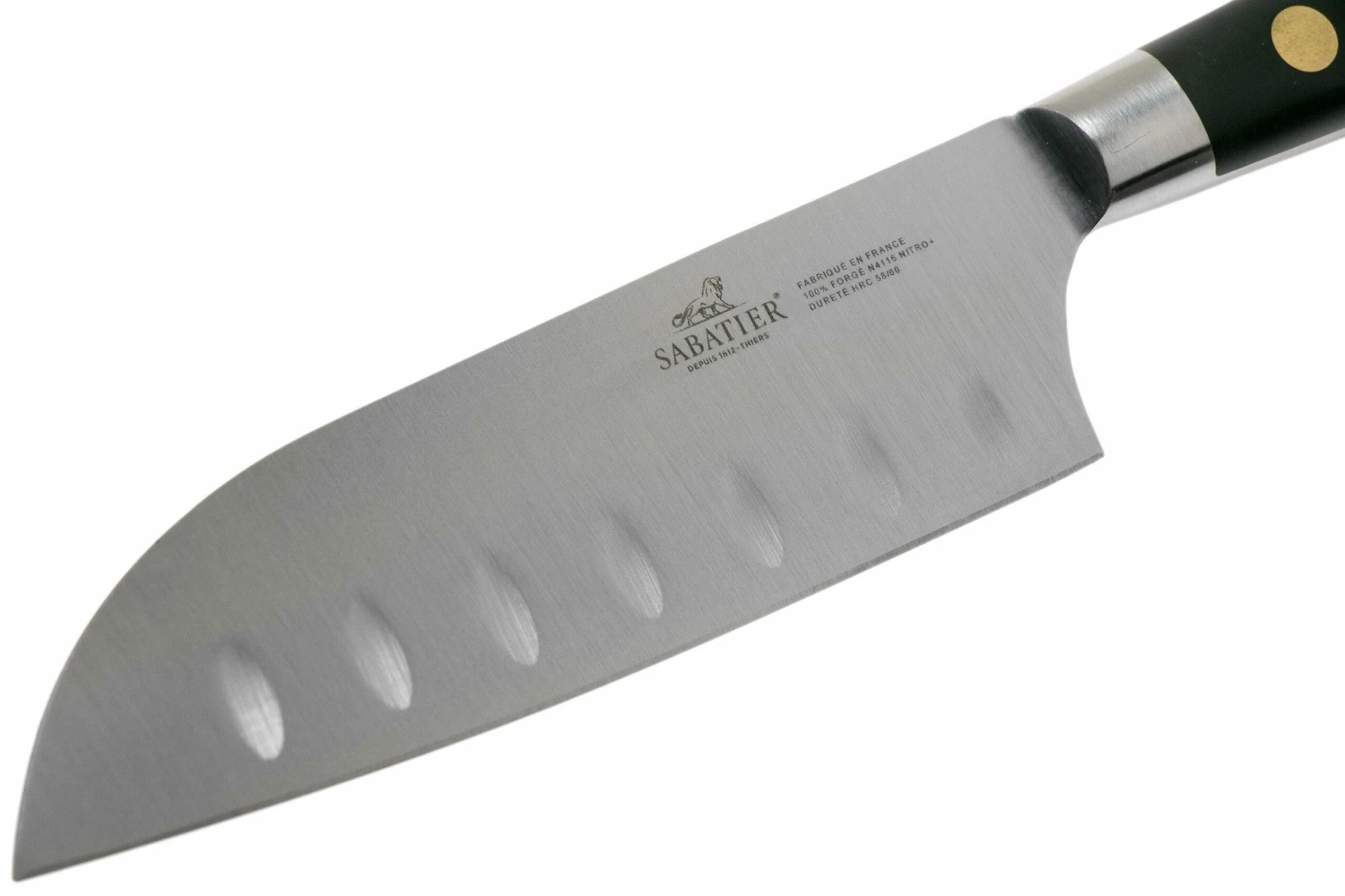 El Lion Sabatier Idéal Santoku es un pequeño cuchillo de cocina que puede realizar casi cualquier tarea en la cocina. Los hoyuelos de la hoja garantizan que ningún ingrediente se pegue a la hoja. Elegante y práctico.