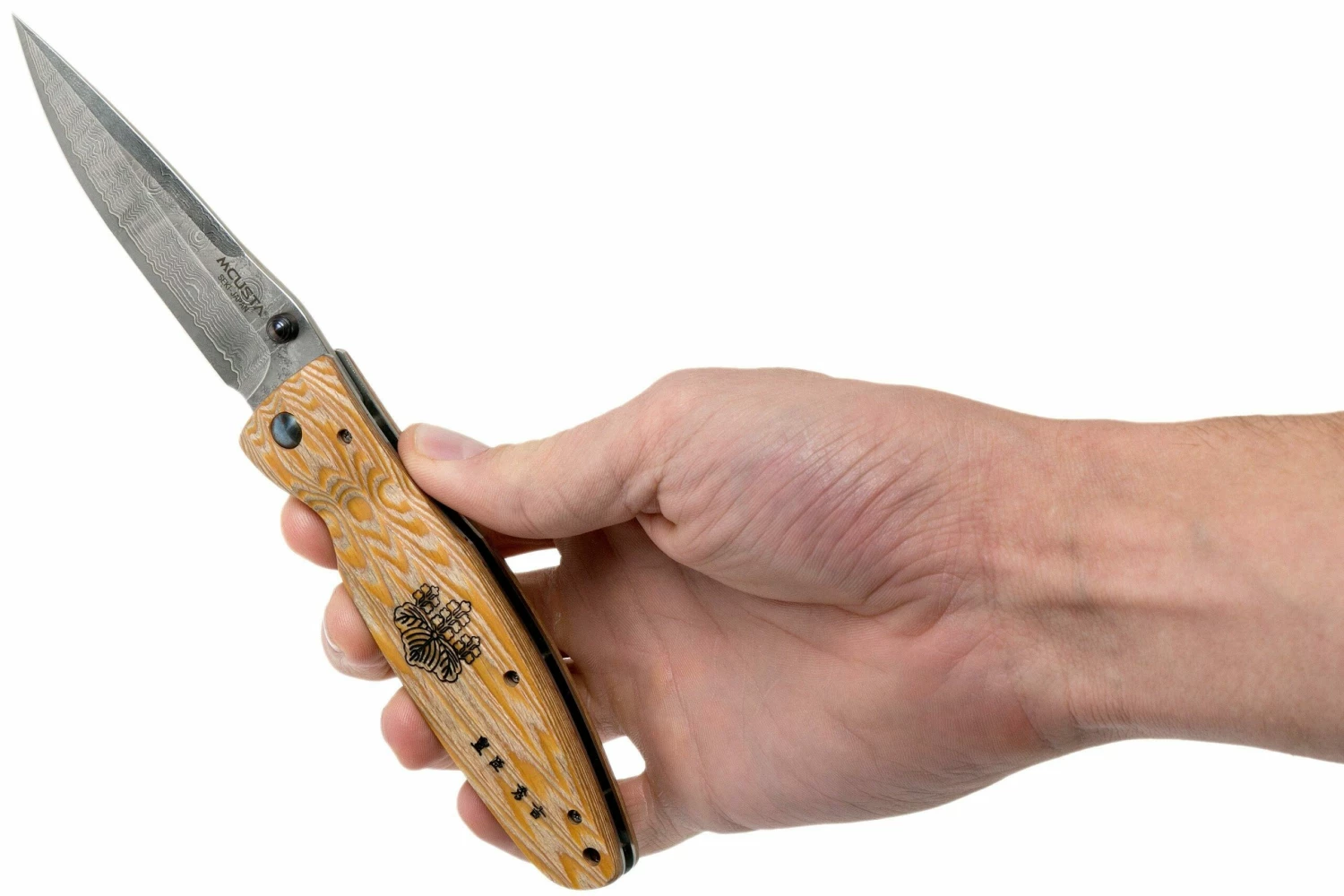 La Mcusta MC-0182D Sengoku Toyotomi Hideyoshi es una extraordinaria navaja japonesa, con impresionantes detalles. La hoja está compuesta por un núcleo de acero VG10, revestido de acero de Damasco niquelado. Como es de esperar de los fabricantes japoneses, el filo es muy afilado. El mango es especialmente bonito. La madera está tallada en 3D para un agarre de aspecto agradable, y esto es funcional también, ofreciendo una mejor tracción.