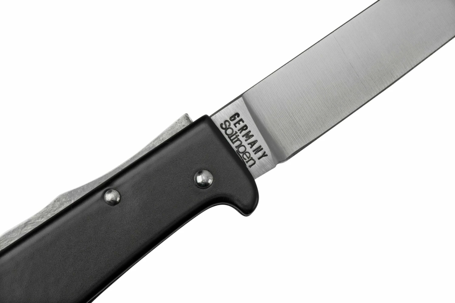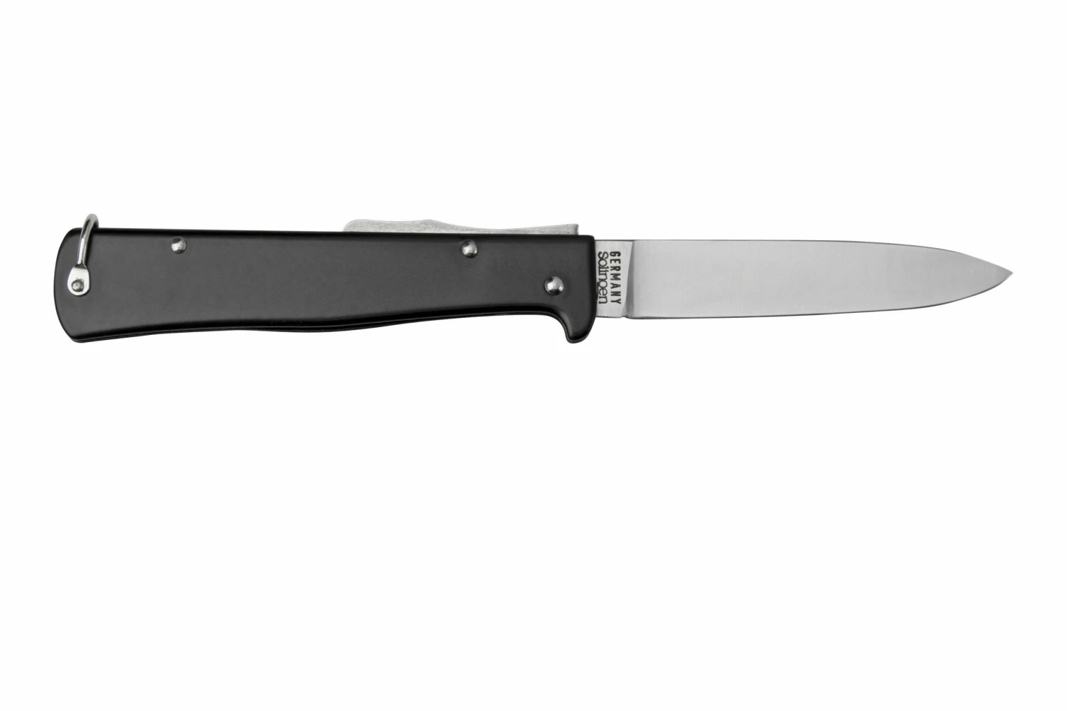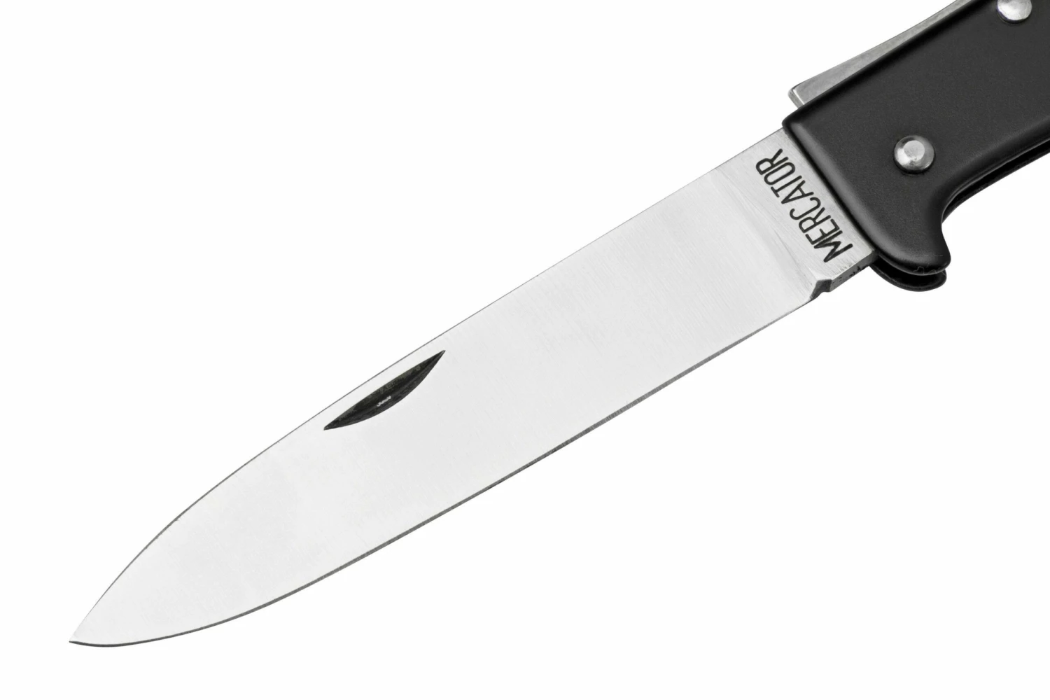 La Otter Mercator 10-426 RG K es una navaja grande. El mango es de acero inoxidable, la hoja de acero al carbono C75. Esta Mercator no está mejorada con un clip de bolsillo. El gancho del acollador permite añadir fácilmente un cordón.