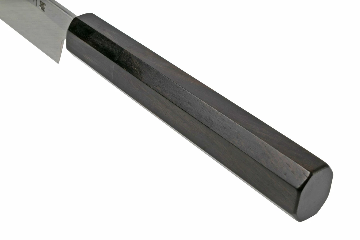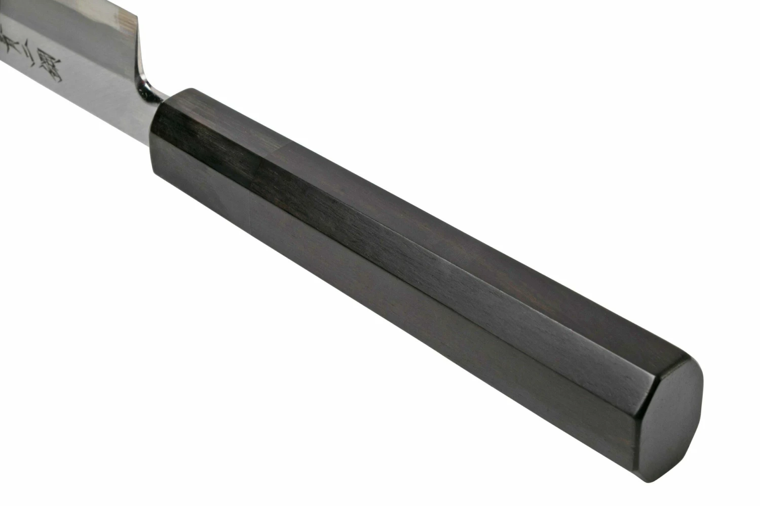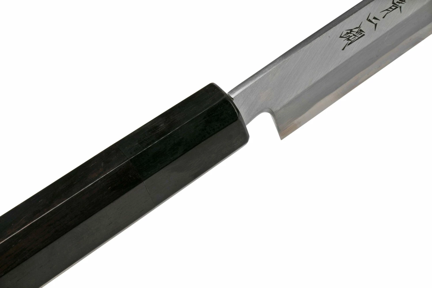 El Sakai Takayuki Blue 2 Steel Japanese Style 01214 fuguhiki es un cuchillo de cocina japonés diseñado originalmente para cortar fugu, el plato asiático elaborado con el pez globo altamente venenoso. Este pescado debe ser fileteado con mucho cuidado para eliminar las partes venenosas del pescado sin contaminar el resto. Los chefs deben recibir una formación especial antes de poder servir el plato. Y, por supuesto, ¡sólo se utiliza el estrecho cuchillo fuguhiki para la preparación!