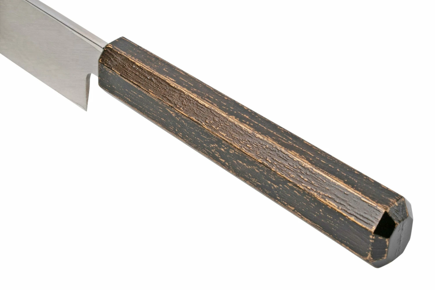 El Sakai Takayuki Nanairo Black Gold 14522 yanagiba es un cuchillo de cocina de un solo filo para cortar rodajas de carne, pescado o verduras. La hoja de 24 cm de longitud permite realizar un movimiento de corte largo por cada rebanada. Esto te permite cortar rodajas extremadamente finas de carne, pescado o verduras. ¡Ideal para el sushi o el sashimi!