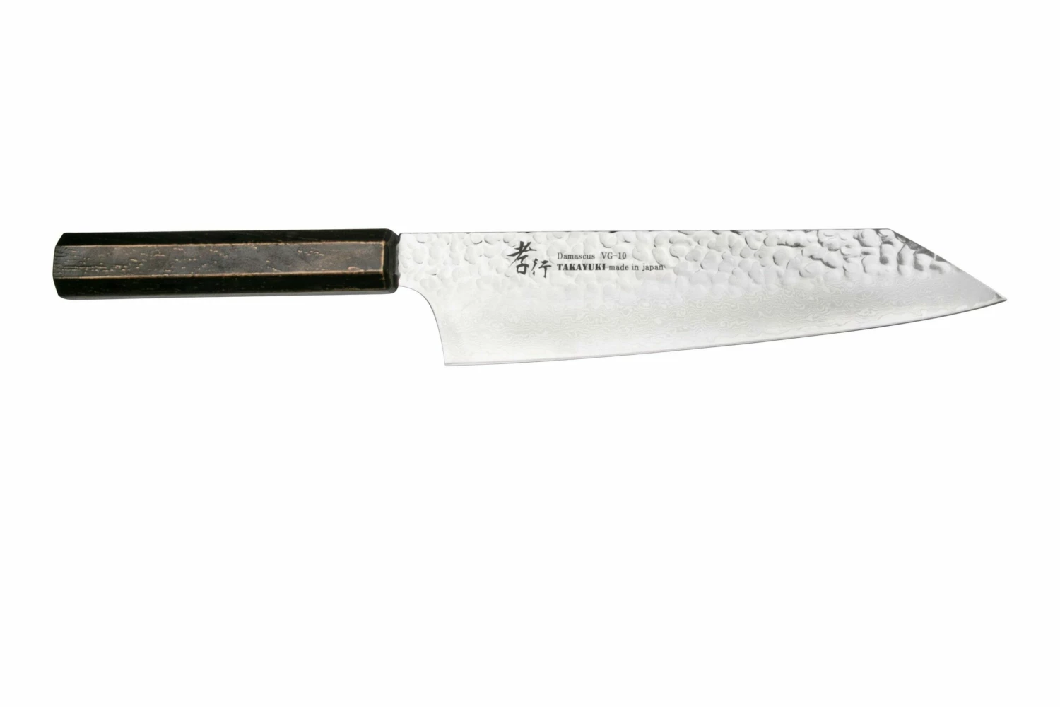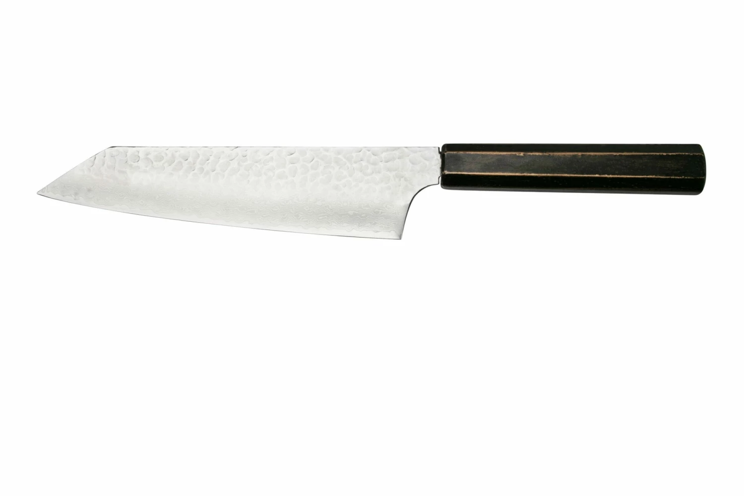 El Sakai Takayuki Nanairo Black Gold 14600 kengata gyuto es un cuchillo de cocina japonés asequible. Kengata gyuto»» significa «»espada de carne»» en japonés. Suena espantoso, pero simplemente significa que este cuchillo se hizo originalmente para preparar la carne. Hoy en día, el cuchillo gyuto se considera un cuchillo de chef polivalente para cualquier tarea de corte en la cocina.