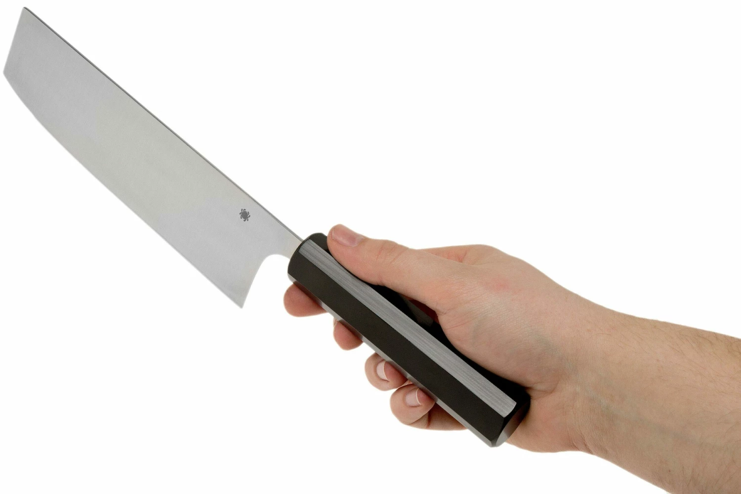 Este cuchillo Spyderco Nakiri de la Colección Murray Carter Wakiita es de una belleza impresionante. Nakiri significa «cortador de verduras». Su forma única y rectangular hace que este cuchillo sea perfecto para cortar todo tipo de verduras. La punta del cuchillo es ligeramente redondeada para asegurarte que también puede cortar rápidamente verduras en ángulo. Además, podrás cortar hierbas en porciones minúsculas con gran facilidad.